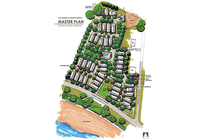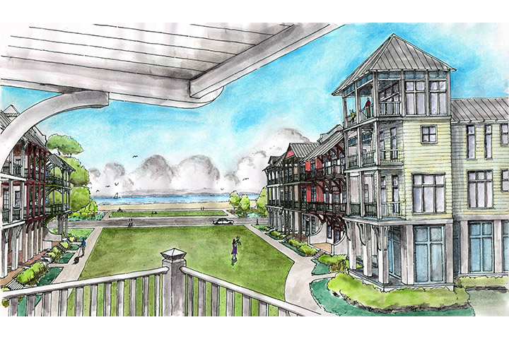 With the homes having to be elevated, we took consideration for the sense of scale of the structures by creating large green spaces between the homes. These large open spaces will be developed as community amenities while allowing for separation between the multi-story structures.